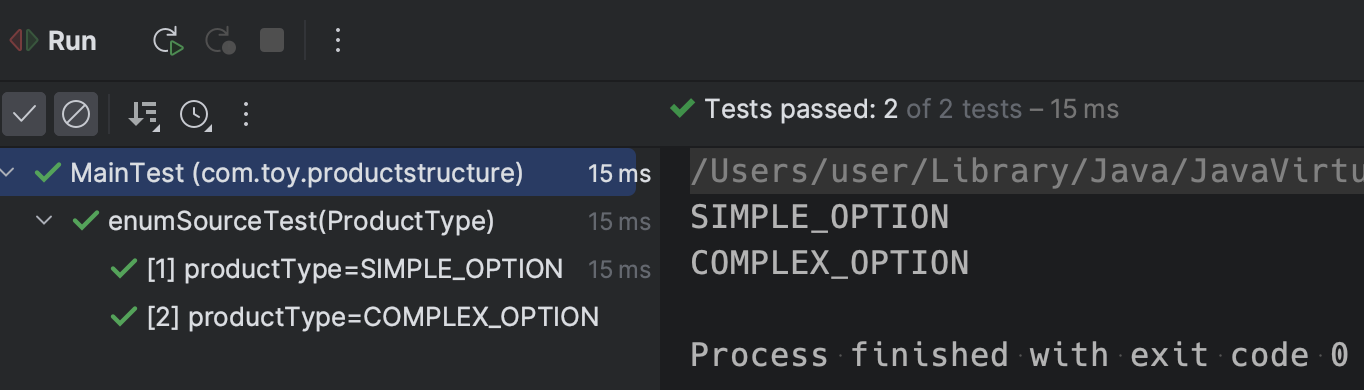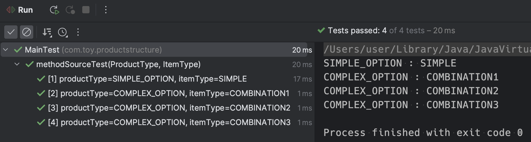 org.junit.jupiter.api.DynamicTest 와 TestFactory 를 활용하는 방법도 있다. 코드를 먼저 보자. Stream.of 로 4가지 Enum 조합을 셋팅해주고 flatMap 에서 각각 DynamicTest.dynamicTest 를 돌리는 구조다.